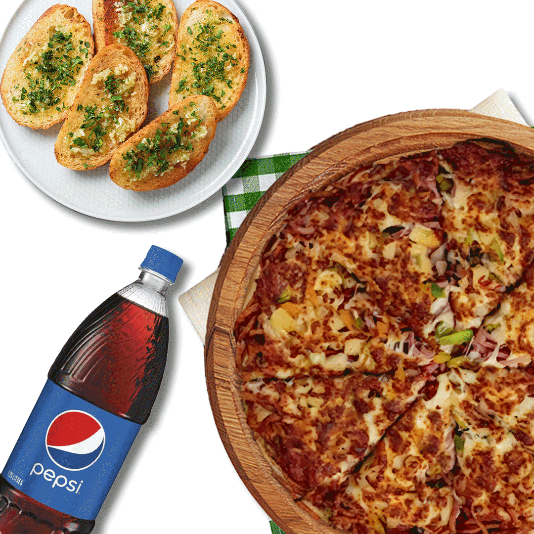Deal 5$48.902 family pizza, garlic bread, 1.25L soft drink