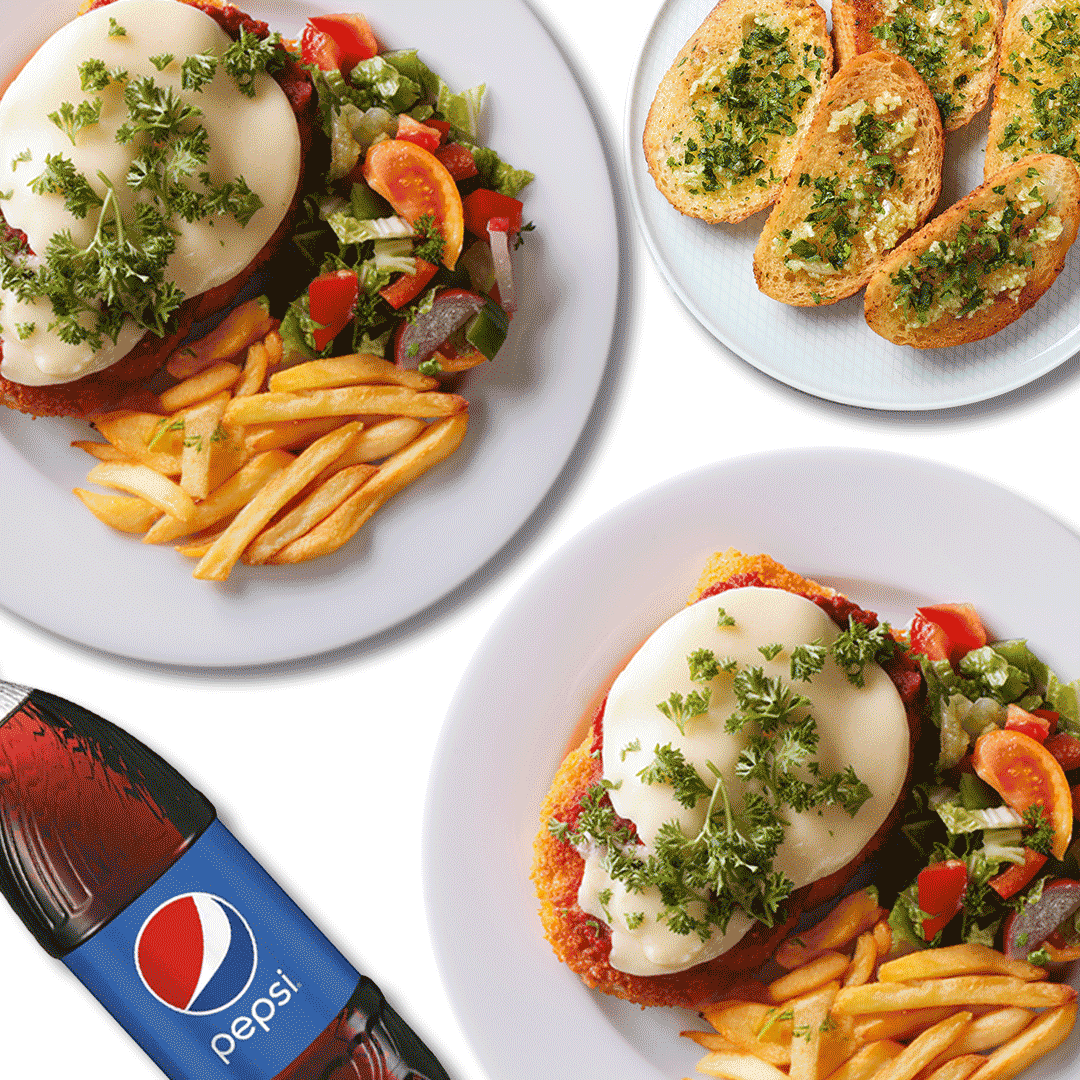 Deal 6$52.902 chicken parmas, garlic bread, chips, salad & 1.25L soft drink